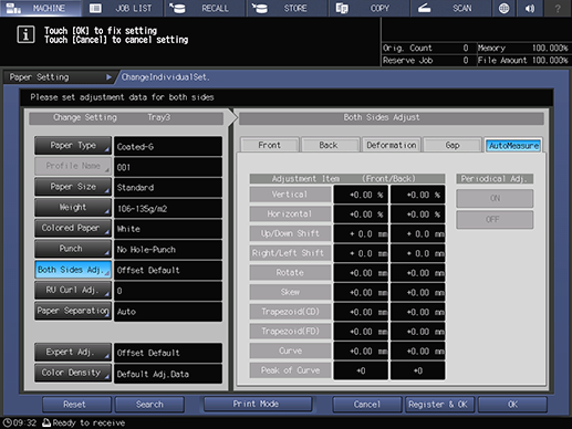Touch panel - [MACHINE] - [Reg./Del.PaperSet.] - [Add/Edit] - [Both Sides Adj.] - [AutoMeasure] | |||
