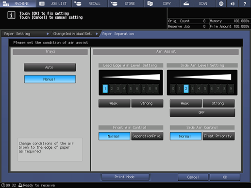 The air volume can be adjusted manually depending on the paper type or working environment. The air volume can be set in 9 levels, from 1 to 9.