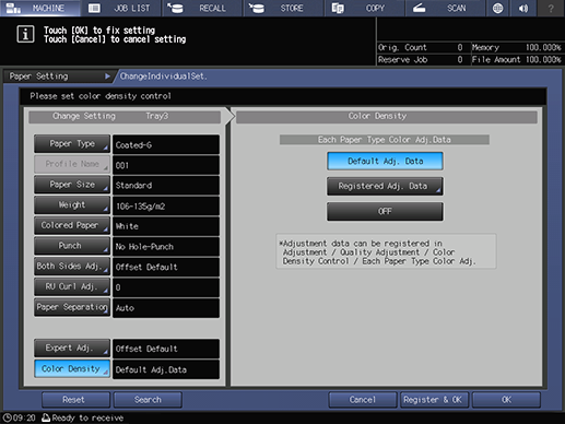 Screen access | Touch panel - [MACHINE] - [Paper Setting] - [Change Set] - [Color Density] | ||