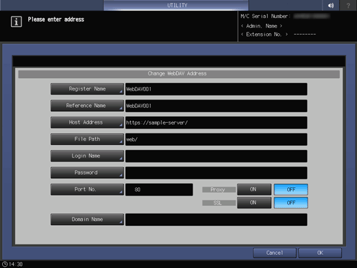 Control panel - Utility/Counter - [Scan Address Register] - [Address Edit] - [WebDAV] - [Change]
