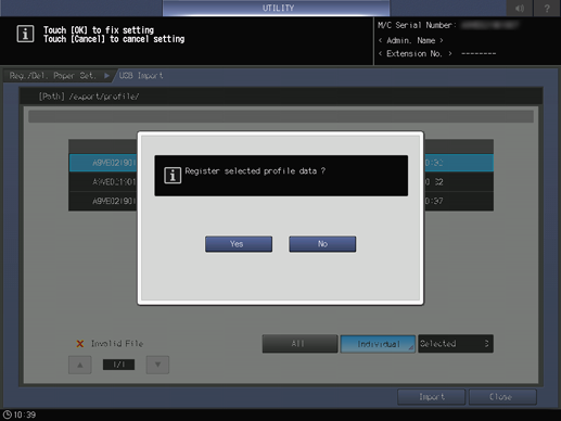 [Individual] | Selects the paper profile you want to import from the paper profiles stored on the USB flash drive, and imports it to this system. Selecting New Store allows you to import up to 500 paper profiles together with the number of data items registered to this system (the number of paper profiles that can be imported is calculated by subtracting the number of registered paper profiles from 500). Selecting Overwrite allows you to import up to 500 paper profiles. | ||