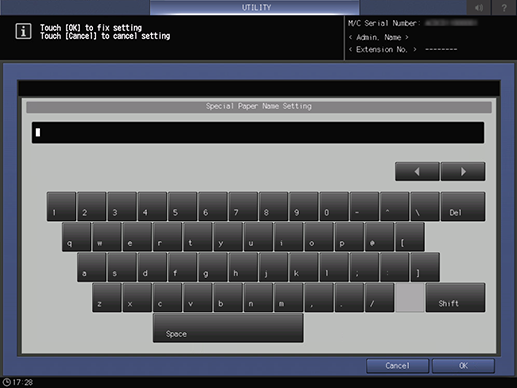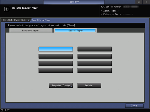 [Delete] | Deletes the registered [Special Paper]. Press this item to display a dialog box, and then press [Yes] to delete the target. | ||