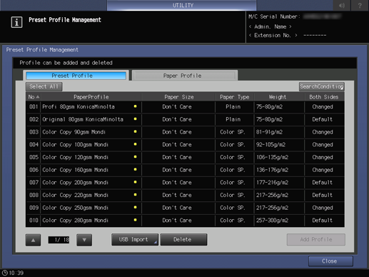 Control panel - Utility/Counter - [User Setting] - [System Setting] - [Paper Tray Setting] - [Paper Setting] - [Preset Profile Management]