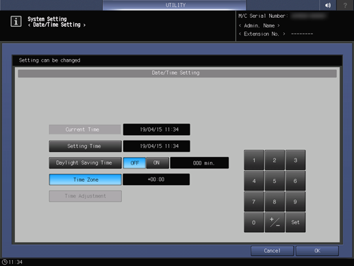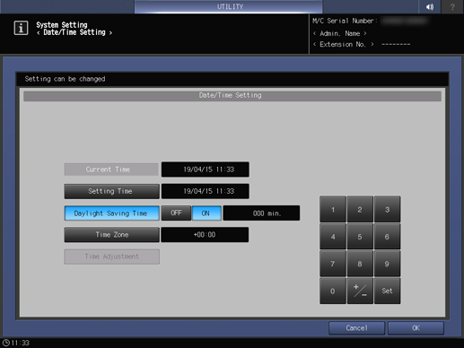 Control panel - Utility/Counter - [Administrator Setting] - [System Setting] - [Date/Time Setting] | ||||