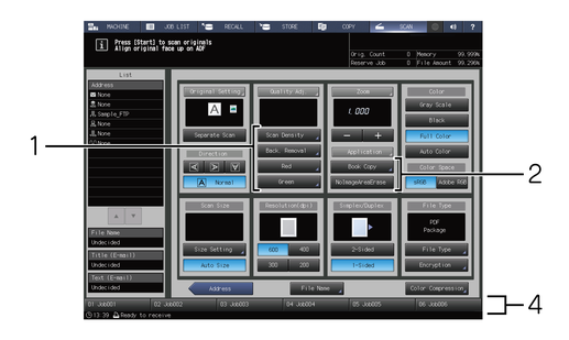 2 | [Application] | Up to four items can be set. For details, refer to [Application(Copy)]. | Up to two items can be set. For details, refer to [Application(Scan)]. | - |