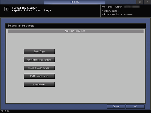 Screen access | Control panel - Utility/Counter - [User Setting] - [System Setting] - [Shortcut Key Register] - [Application(Scan)] | ||