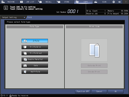 Touch panel - [COPY] - [Output Setting] - [Fold]