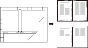 When a thick original such as a book is scanned using the Original glass, black copy marks may be produced along the borders or center lines. Selecting [FrameCenterErase] sets the position and width of black copy marks, and erases them.