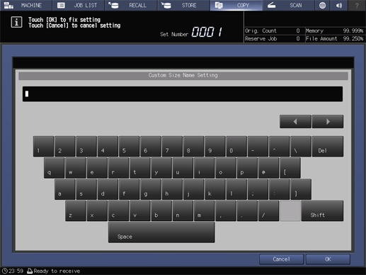 Screen access | Touch panel - [COPY] - [Original Setting] - [Custom] - [Input Size] - [Size Registration] | ||