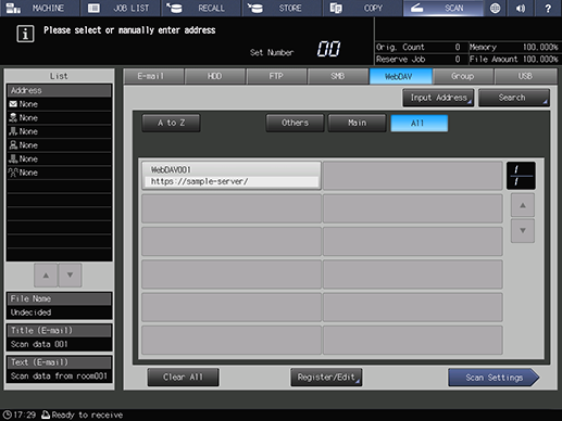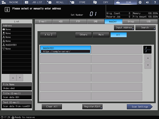 Screen access | Touch panel - [SCAN] - [WebDAV] | ||