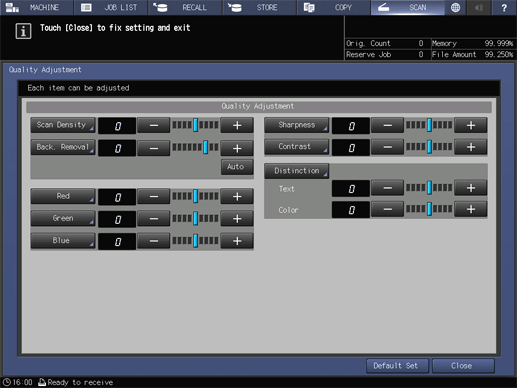Touch panel - [SCAN] - Select a destination. - [Scan Settings] - [Quality Adj.]