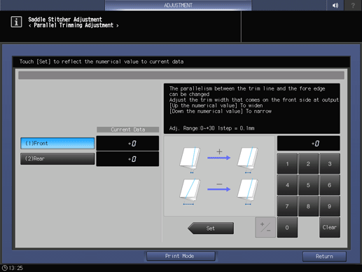 Screen access | Touch panel - [MACHINE] - [Adjustment] - [Finisher Adjustment] - [Saddle Stitcher Adjustment] - [Parallel Trimming Adjustment] | ||
