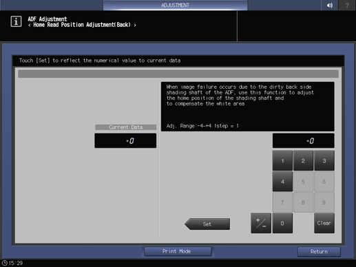 Screen access | Touch panel - [MACHINE] - [Adjustment] - [ADF Adjustment] - [Home Read Position Adj(Back)] | ||