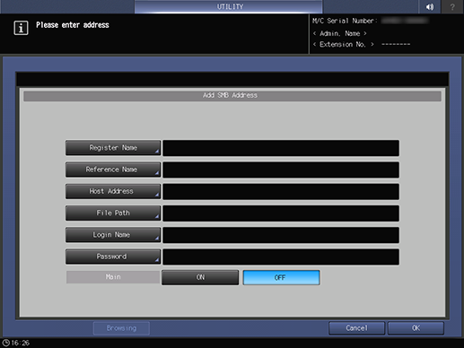 Control panel - Utility/Counter - [Administrator Setting] - [Scan Address Register] - [Address Edit] - [SMB] - [Add]