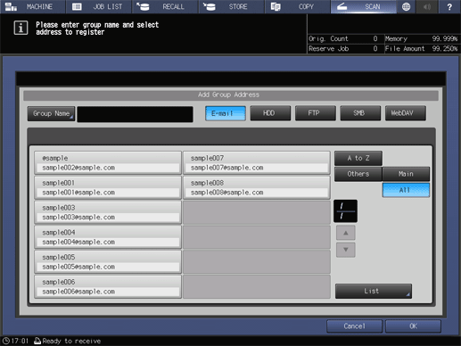 Control panel - Utility/Counter - [Administrator Setting] - [Scan Address Register] - [Address Edit] - [Group] - [Add] | |||