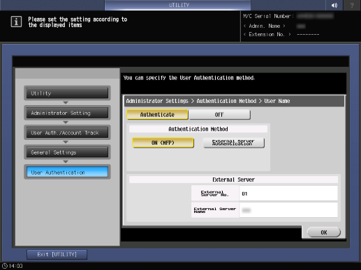 Control panel - Utility/Counter - [Administrator Setting] - [User Auth./Account Track] - [General Settings] - [User Authentication]
