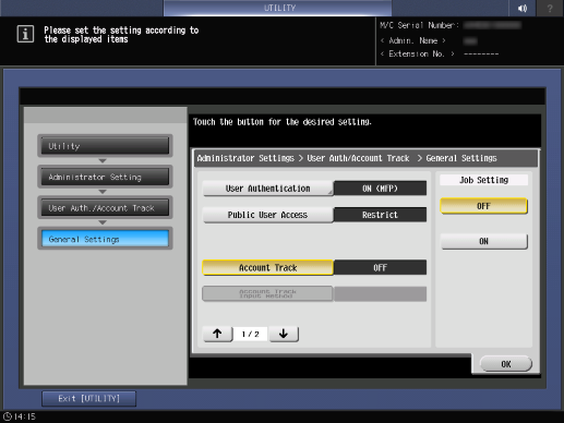Control panel - Utility/Counter - [Administrator Setting] - [User Auth./Account Track] - [General Settings] - [Account Track]