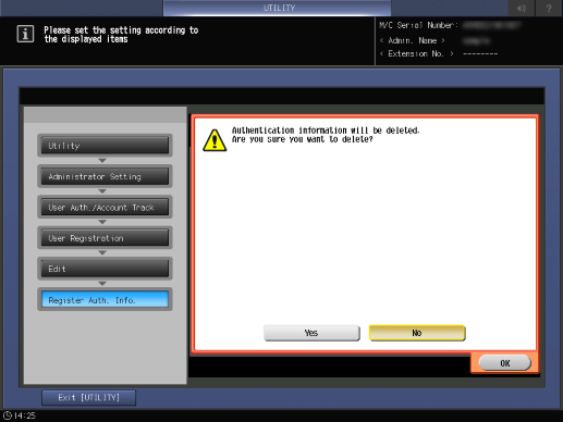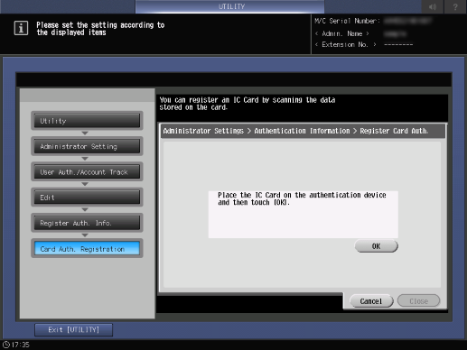 Screen access | Control panel - Utility/Counter - [Administrator Setting] - [User Auth./Account Track] - [User Authentication Settings] - [User Registration] - [Edit] - [Register Authentication Information] | ||