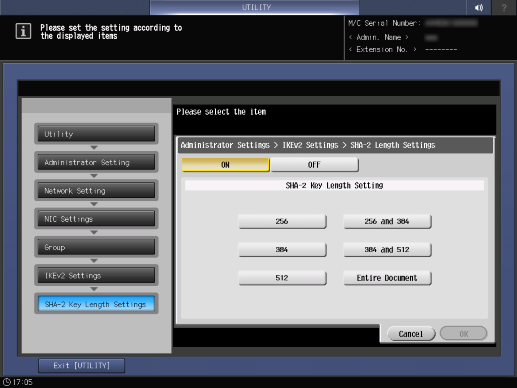 Screen access | Control panel - Utility/Counter - [Administrator Setting] - [Network Setting] - [NIC Settings] - [TCP/IP Settings] - [IPsec Settings] - [IPsec Settings] - [IPsec SA Settings] - [Edit] - [IKEv2] | ||