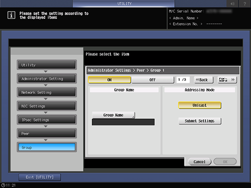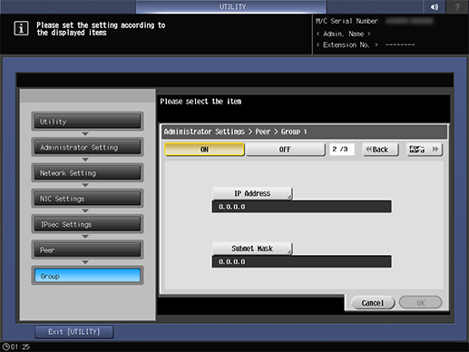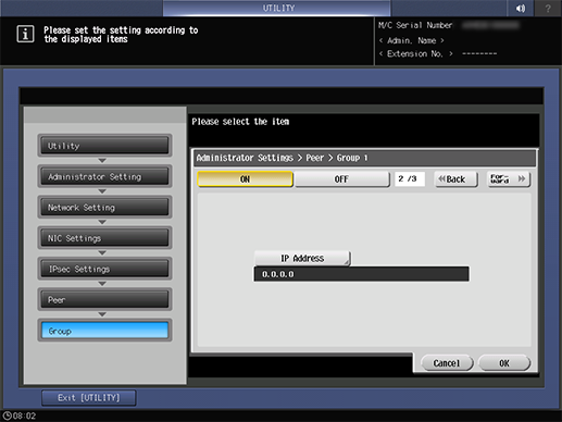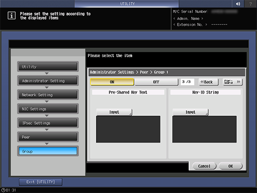 Control panel - Utility/Counter - [Administrator Setting] - [Network Setting] - [NIC Settings] - [TCP/IP Settings] - [IPsec Settings] - [IPsec Settings] - [Peer] - Select one group - [Edit]
