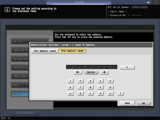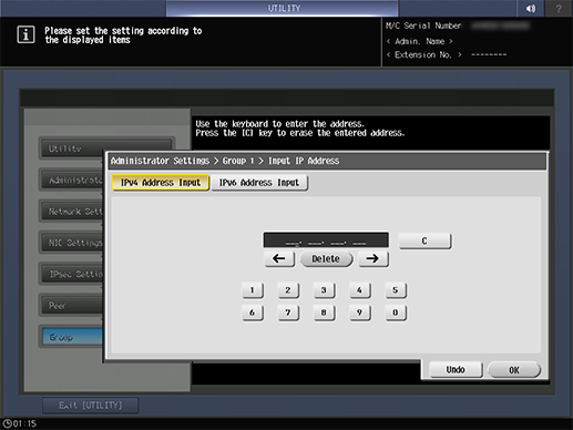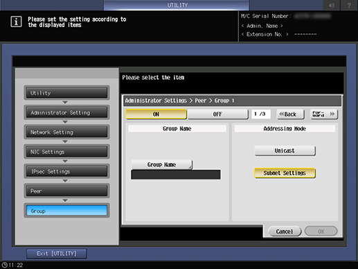 Screen access | Control panel - Utility/Counter - [Administrator Setting] - [Network Setting] - [NIC Settings] - [TCP/IP Settings] - [IPsec Settings] - [IPsec Settings] - [Peer] - Select one group - [Edit] | |||