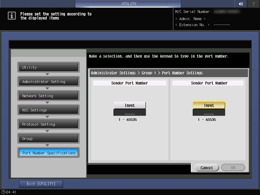 Screen access | Control panel - Utility/Counter - [Administrator Setting] - [Network Setting] - [NIC Settings] - [TCP/IP Settings] - [IPsec Settings] - [IPsec Settings] - [Protocol Setting] - Select one group - [Edit] - [Port Number] | ||