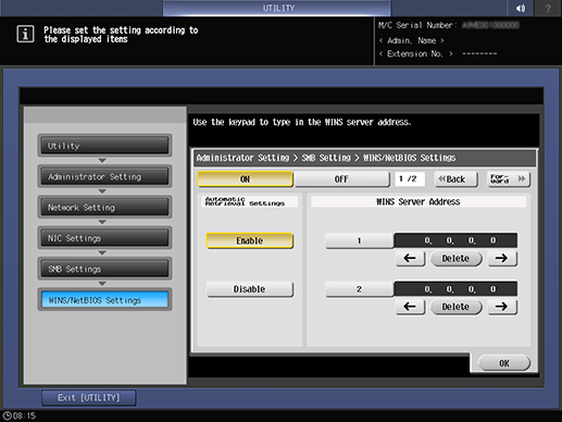 Control panel - Utility/Counter - [Administrator Setting] - [Network Setting] - [NIC Settings] - [SMB Settings] - [WINS/NetBIOS Settings]