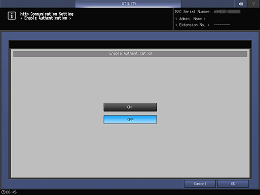 Control panel - Utility/Counter - [Administrator Setting] - [Network Setting] - [http Communication Setting] - [Enable Authentication]