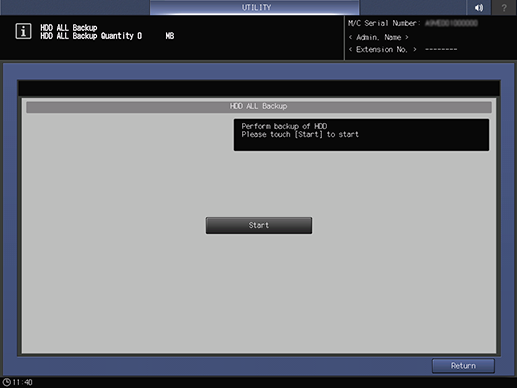 Screen access | Control panel - Utility/Counter - [Administrator Setting] - [Security Setting] - [HDD Management Setting] - [HDD Restore/Backup] | ||