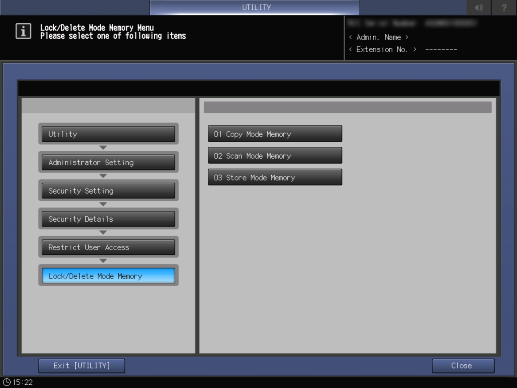 Control panel - Utility/Counter - [Administrator Setting] - [Security Setting] - [Security Details] - [Restrict User Access] - [Lock/Delete Mode Memory]