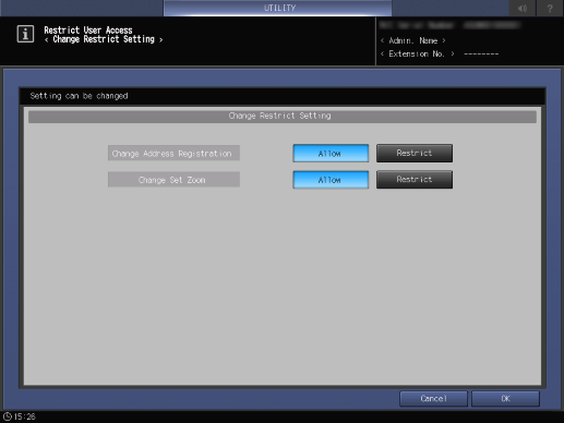 Control panel - Utility/Counter - [Administrator Setting] - [Security Setting] - [Security Details] - [Restrict User Access] - [Change Restrict Setting]