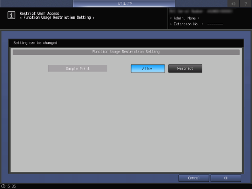 Control panel - Utility/Counter - [Administrator Setting] - [Security Setting] - [Security Details] - [Restrict User Access] - [Function Usage Restriction]