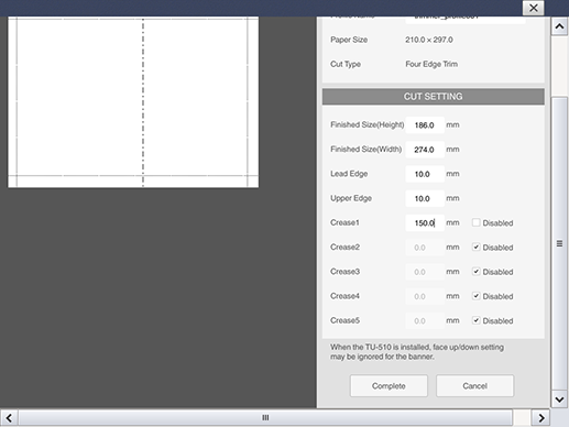The setting items vary depending on [Cut Type]. For details, refer to [Four Edge Trim], [Multiple Cutting], [Card Cutting], or [Advanced Setting].