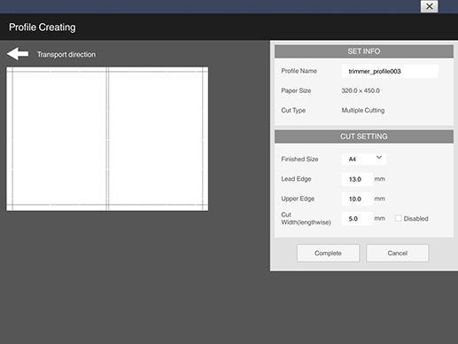 Set a trimmer profile for Multiple Cutting. You can set the finishing size and cut position.