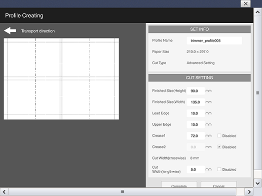 Touch panel - [MACHINE] - [Trimmer Profile] - [Create] - Select [Advanced Setting]. - [OK]
