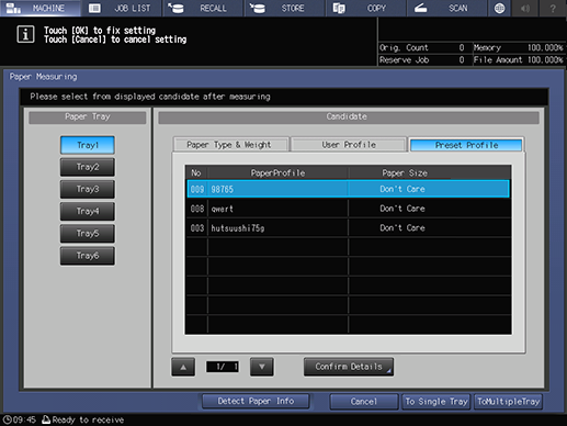 Screen access | Touch panel - [MACHINE] - [Paper Measuring] - [Preset Profile] | ||