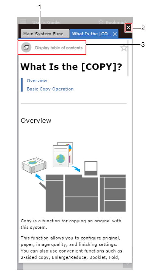 3 | [Display table of contents] | Tap this item to display the page displayed with a modal window as a new tab of a new window. To display the Contents bar again, tap " |