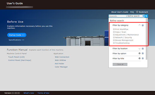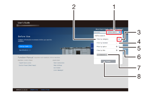 6 | [Filter by title] | Filters the search range by item title of the User's Guide. Clicking or tapping this item displays a modal window that enables you to select an item title. |