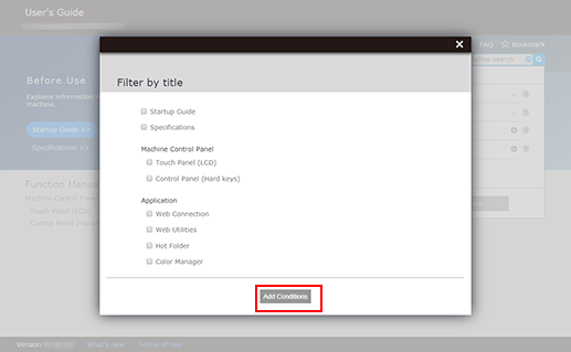 Clicking or tapping [Filter by title] displays a modal window that enables you to select a title. Select the check boxes of the items you want to include in the search range, and click or tap [Add Conditions]; the items are set as search conditions.