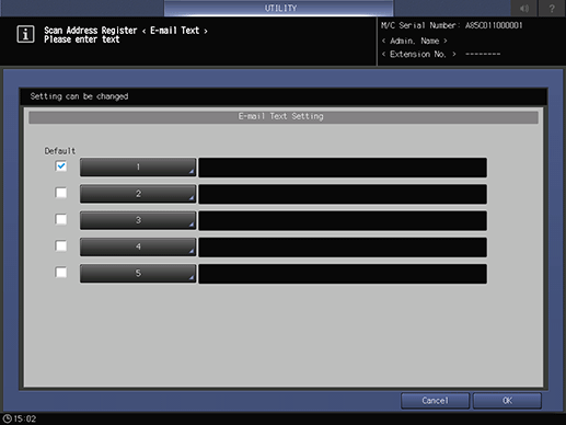 [E-mail Text Setting] | Register up to 5 E-mail texts. Also, edit registered texts. |
