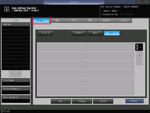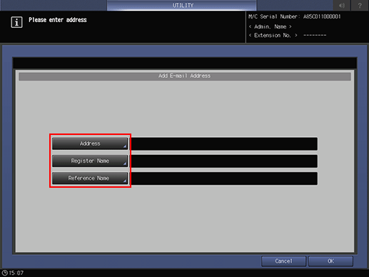 Enter information of a destination on the [Add E-mail Address] screen. Pressing each item displays each screen to enter characters.