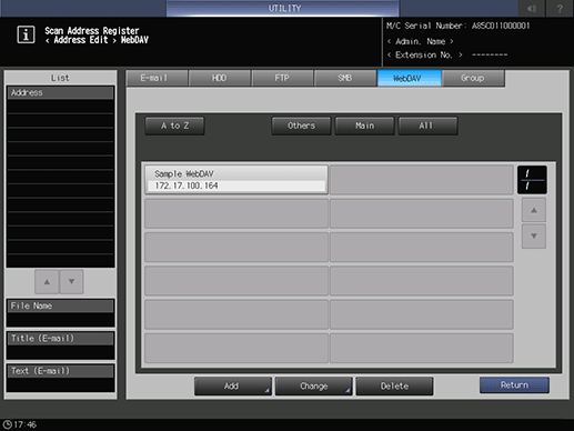 Register a WebDAV server. Sending scan data to an WebDAV server is made easy by registering the WebDAV server as a destination.