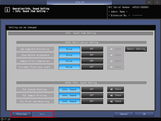 The [Job Complete Pre-notice] provided under [Other Notification Setting] allows you to specify whether or not to use the expected job completion time for information sound. Press [Detail Setting], then select the desired time. Press [OK] to complete the setting and return to the previous screen.
