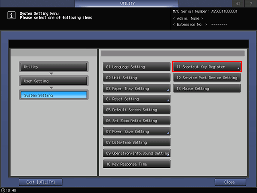 Press [System Setting] on the [User Setting Menu] screen, and then press [Shortcut Key Register].