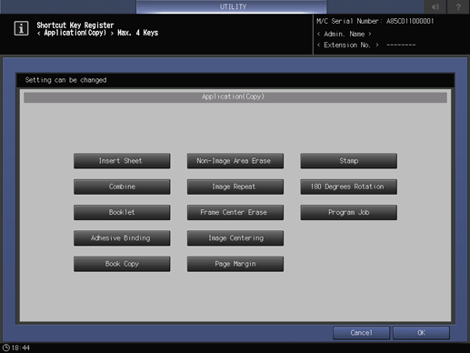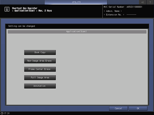 [SCAN] Screen - To display the shortcut keys under [Application] of the Scan Setting screen, press [Application (Scan)] to display the [Shortcut Key Register] screen.