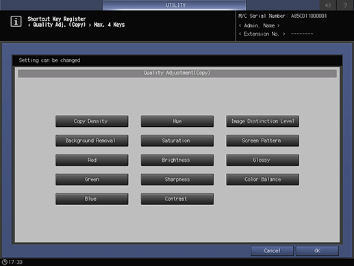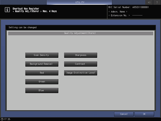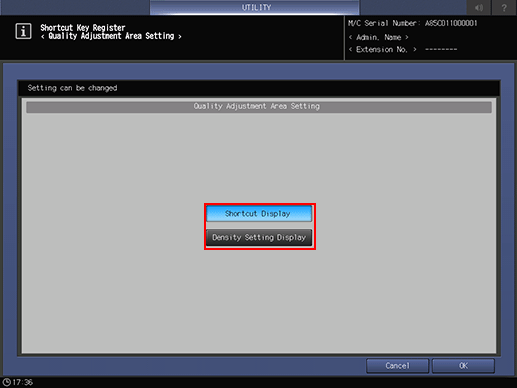 Select either shortcut keys or density settings to be displayed under [Quality Adj.] of the [COPY] screen, the Scan Setting screen accessible from the [SCAN] screen, and the [STORE] screen. When you select the density setting, the screen does not display the shortcut keys specified in [Quality Adj.] of the [COPY] screen and Scan Setting screen accessible from the [SCAN] screen and [STORE] screen.