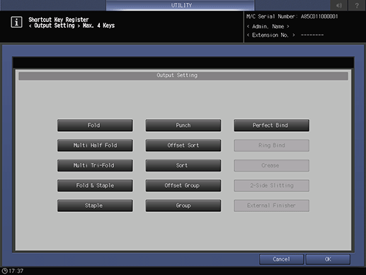 To display the shortcut keys under [Output Setting] on the [COPY] screen, press [Output Setting] to display the [Shortcut Key Register] screen.