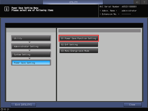 For subsequent operations, follow the same procedure as that in [User Setting] - [System Setting] - [Power Save Setting] - [Power Save Function Setting]. For details, refer to Power Save Function Setting: Selecting the Power Save Mode.