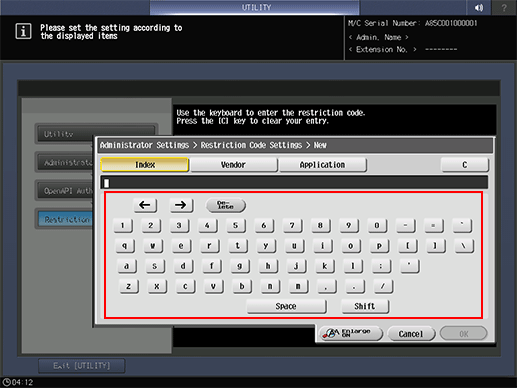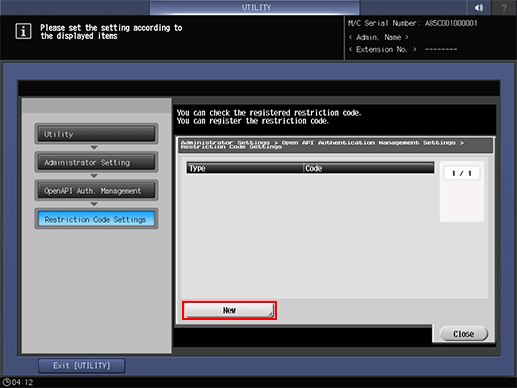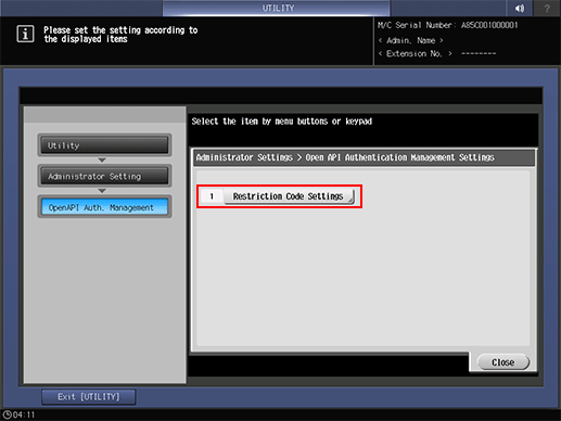 Press [OpenAPI Auth. Management] on the [Administrator Setting Menu] screen, and then press [Restriction Code Settings].