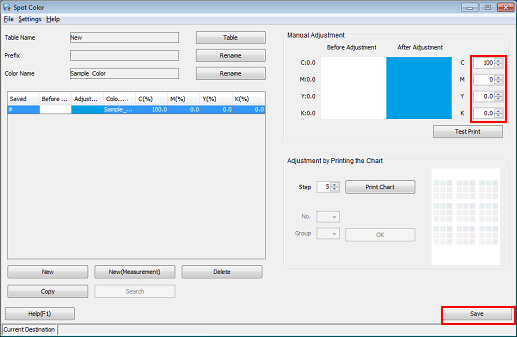 When printing, the spot color tables are searched from the top of the table on the [Spot Color] screen. If the same spot color is saved in more than one spot color table, the first spot color found is applied.